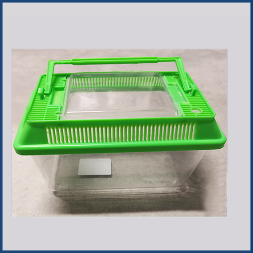 Acquario in plastica dalla forma rettangolare. Con apertura nella parte superiore e sportello trasparente.